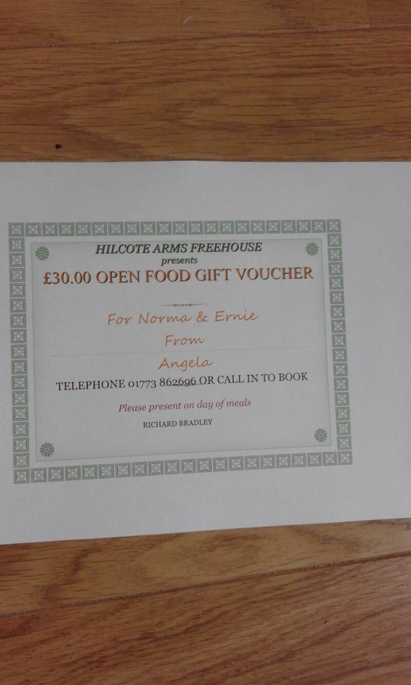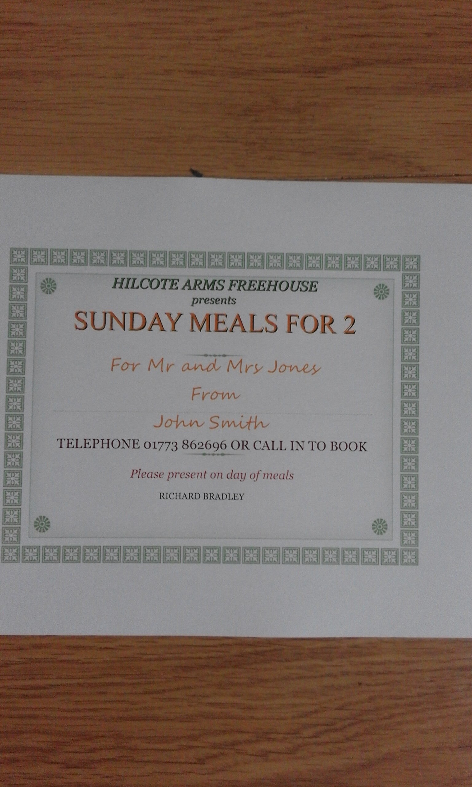 (01773 86 26 96) or by calling in person to The Hilcote Arms. Collection of the gift vouchers must be made in person from The Hilcote Arms.